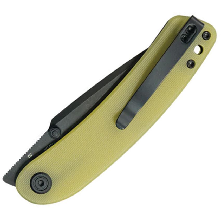 Model/Item/Part Number - KUB344O. Kubey Momentum Linerlock Knife Yellow. 4.5" (11.43cm) closed. 3.5" (8.89cm) BlackWash finish D2 tool steel drop point blade. Translucent yellow G10 handle. Extended tang. Lanyard hole. Pocket clip. Thumb stud. Boxed. Made in China.