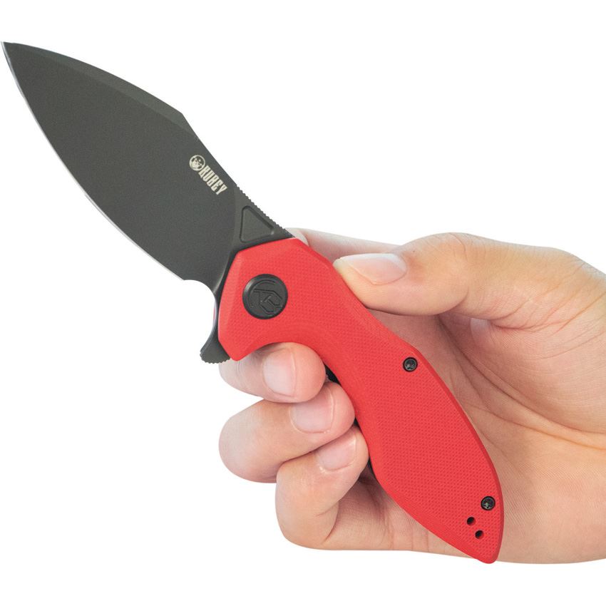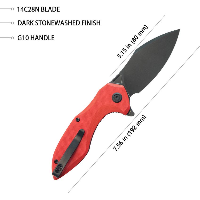 Model/Item/Part Number - KUB236P. Kubey Noble Linerlock Knife Red. 4.38" (11.13cm) closed. 3.13" (7.95cm) black stonewash finish 14C28N Sandvik stainless clip point blade. Red G10 handle. Extended tang. Pocket clip. Boxed. Made in China.