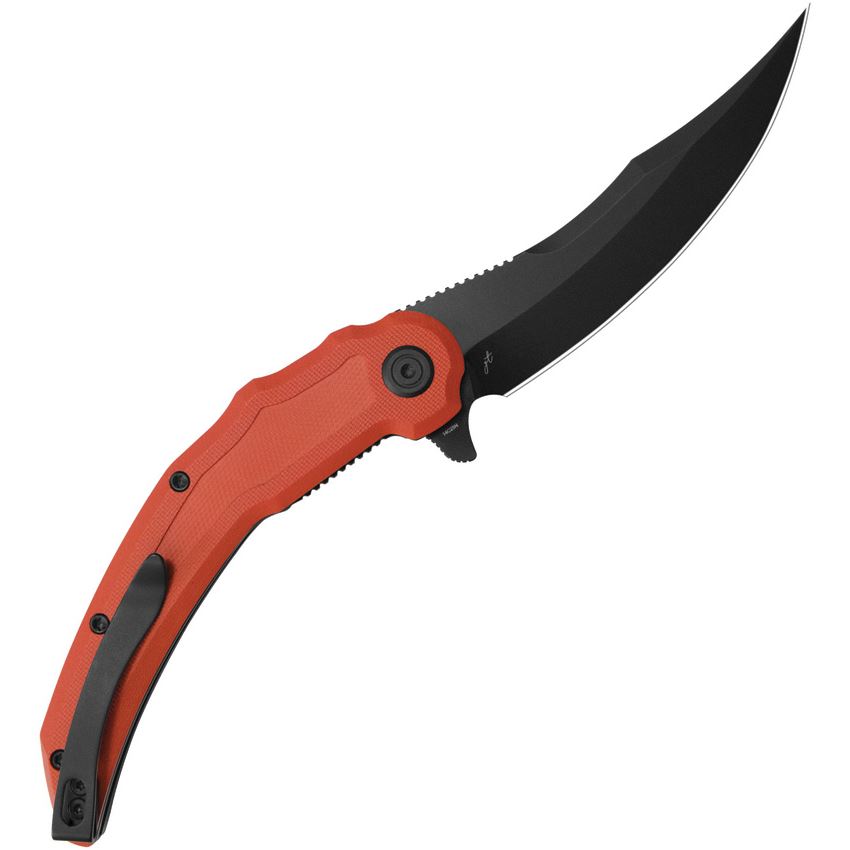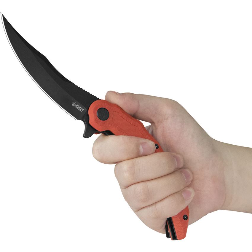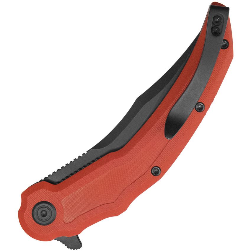 Model/Item/Part Number - KUB346E. Kubey Wave Crest Linerlock Knife Red. 4.88" (12.4cm) closed. 3.75" (9.53cm) black finish 14C28N Sandvik stainless blade. Red G10 handle. Extended tang. Pocket clip. Lanyard hole. Boxed. Made in China.