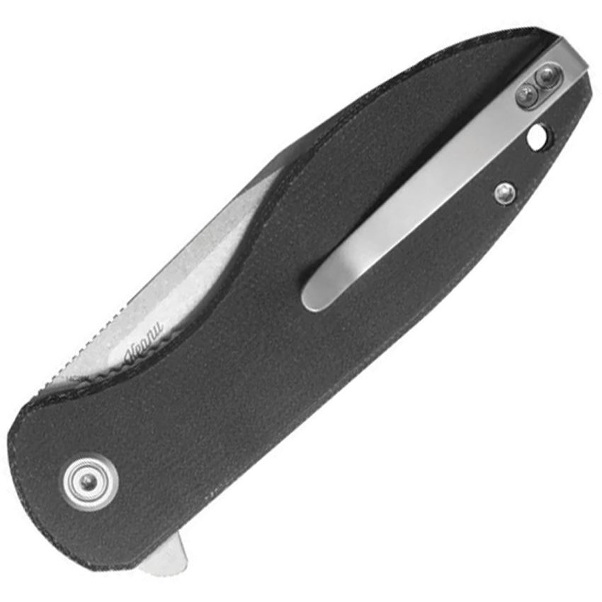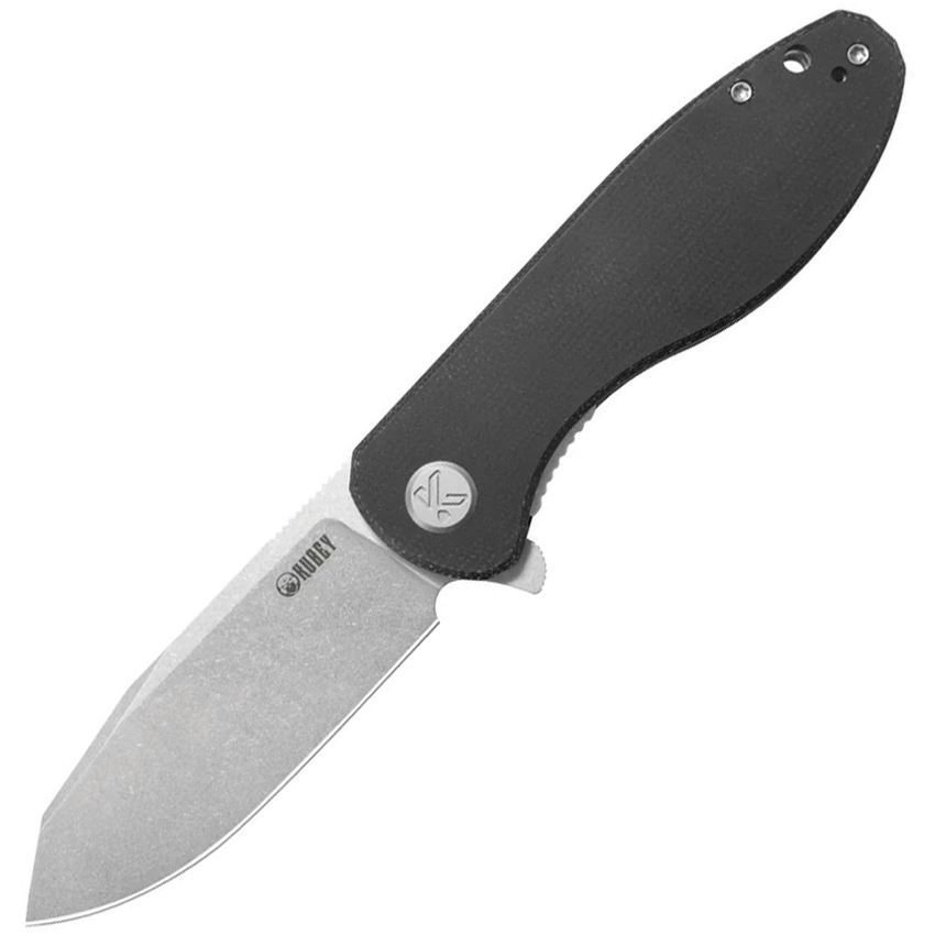 Model/Item/Part Number - KUB358K. Kubey Master Chief Linerlock Knife Mic. 4.63" (11.76cm) closed. 3.63" (9.22cm) stonewash finish 14C28N Sandvik stainless reverse tanto blade. Black micarta handle. Extended tang. Lanyard hole. Pocket clip. Boxed. Made in China.