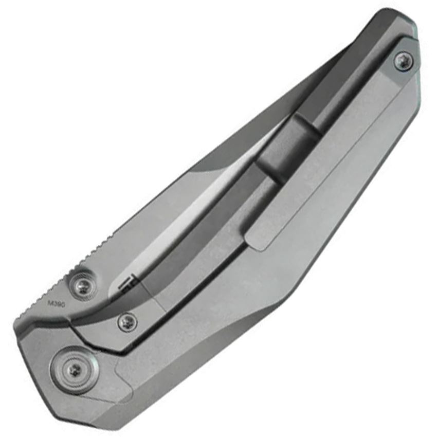 Model/Item/Part Number - KUB417A. Kubey Eclipse Framelock Knife SandBlast. 4.25" (10.8cm) closed. 3.25" (8.26cm) sand blast finish Bohler M390 stainless drop point blade. Sand blast finish titanium handle. Thumb stud. Pocket clip. Boxed. Made in China.