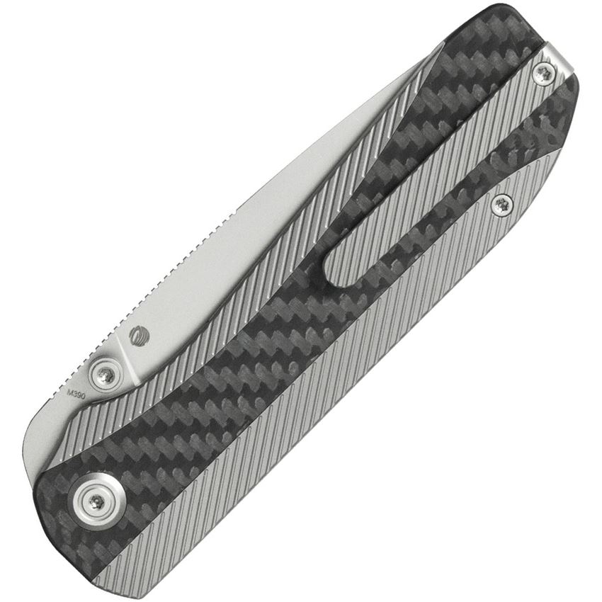 Model/Item/Part Number - KUB431A. Kubey Zephyr Linerlock Knife Gray Ti/CF. 4.63" (11.76cm) closed. 3.75" (9.53cm) bead blast finish Bohler M390 stainless drop point blade. Gray titanium handle with Wave carbon fiber inlay. Thumb stud. Pocket clip. Micro milled handle. Boxed. Made in China.