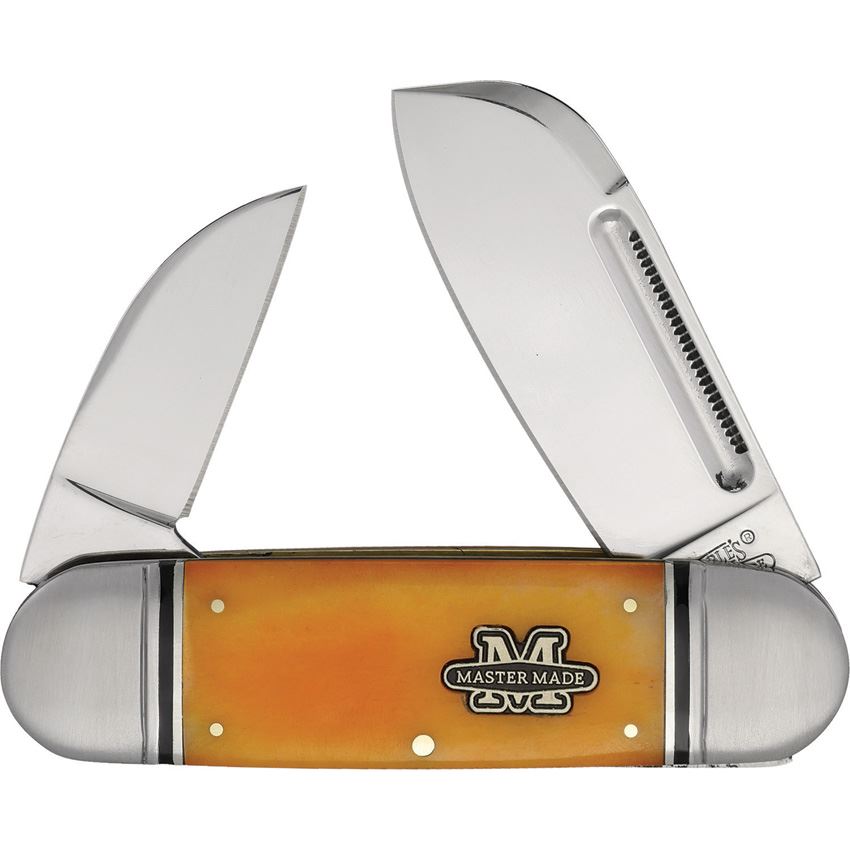 Model/Item/Part Number - MMM001. Marbles Master Made Large Toenail Orange. 4.25" (10.8cm) closed. Mirror finish stainless spear and sheepsfoot blades. Orange smooth bone handle. Stainless bolster(s). Inlay shield. Boxed. Made in China.