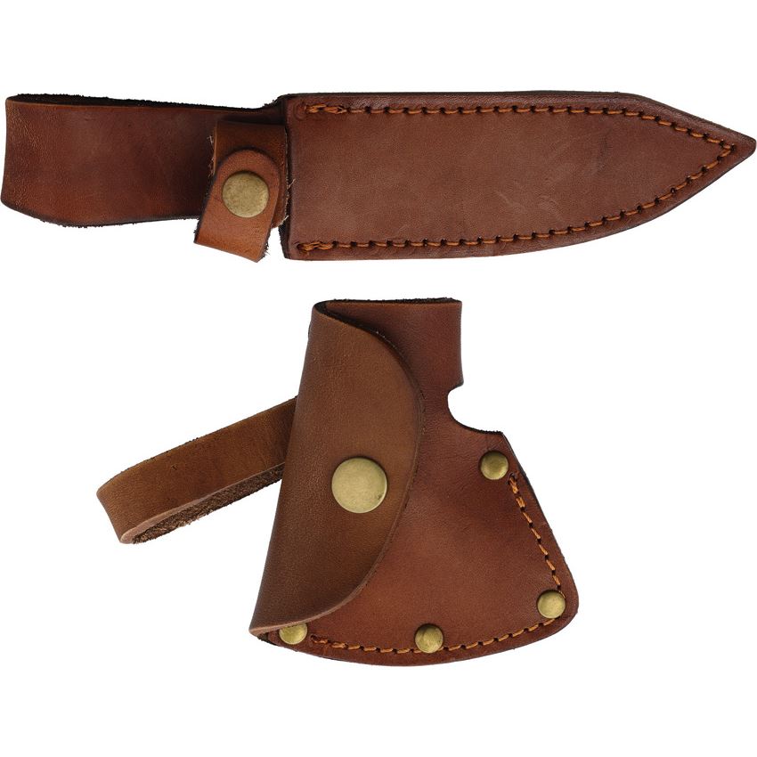 Model/Item/Part Number - MR728. Marbles Hunter Combo Green Micarta. Green micarta handle. Includes: 8" overall fixed blade with 4" satin finish D2 tool steel blade, brass guard and pommel; 9" overall small hatchet with 3.5" two-tone finish forged steel head with 2.13" cutting edge and hammer end, pry pommel. Brown leather belt sheath. Boxed. Made in China.