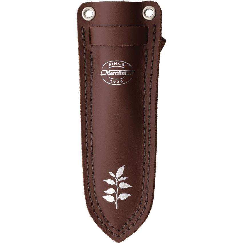 Model/Item/Part Number - MN709017C. Marttiini Herb Knife Birch. 6.8" (17.27cm) overall. 2.75" (6.99cm) satin finish serrated stainless blade. Birch wood handle. Belt/cord cutter. Holes in the blade are meant for removing the leaves of smaller herbs. Brown leather sheath. Boxed with hanging tab. Made in China.
