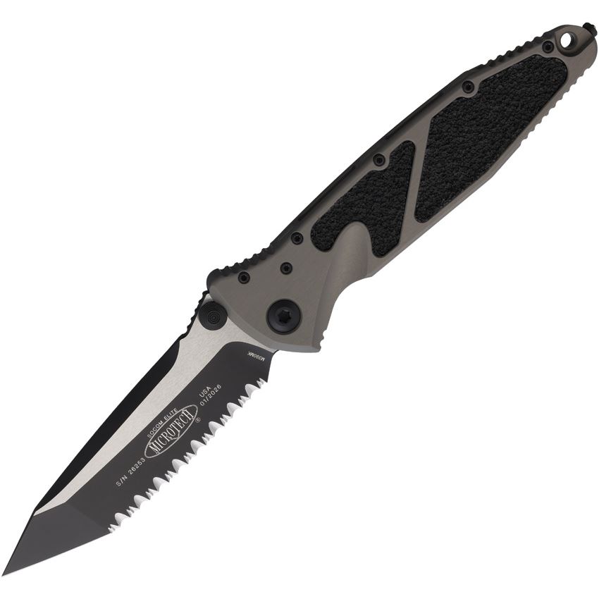 Model/Item/Part Number - MCT1613NC. Microtech Socom Elite T/E Linerlock Knife. 5.13" (13.03cm) closed. 4" (10.16cm) two-tone finish serrated premium steel tanto blade. Gray aluminum handle with black traction insert. Thumb stud. Lanyard hole. Glass breaker. Pocket clip. Boxed. Made in USA.