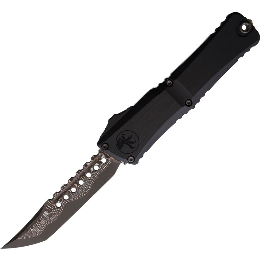 Model/Item/Part Number - MCT121916MS1. Microtech Auto Combat Troodon LT Hellho. Automatic opening. 5.5" (13.97cm) closed. 4" (10.16cm) blade. Black DLC coated aluminum handle. Pocket clip. Lanyard hole. Glass breaker. Baker Forge Coppermal Damascus Hefted Alloy blade. Bronze titanium accents. Boxed. Made in USA.