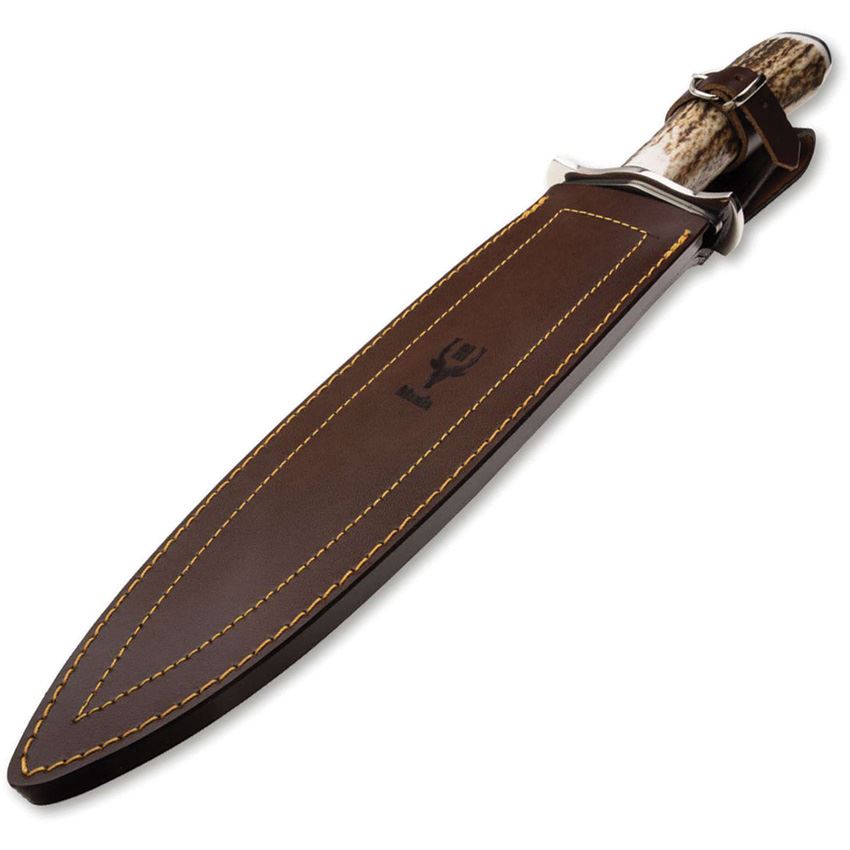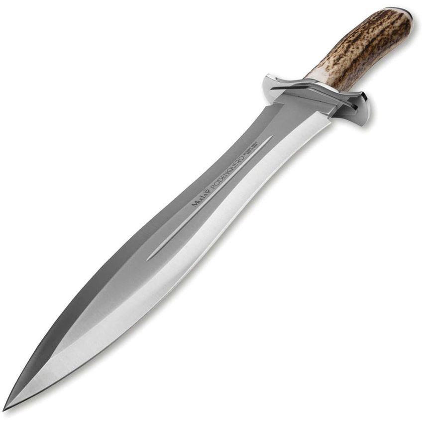 Model/Item/Part Number - MU030. Muela Podenquero. 16.13" (40.97cm) overall. 10.5" (26.67cm) satin finish double edge 1.4116 stainless blade. Stag handle. Stainless guard. Brown leather belt sheath. Boxed. Made in Spain.