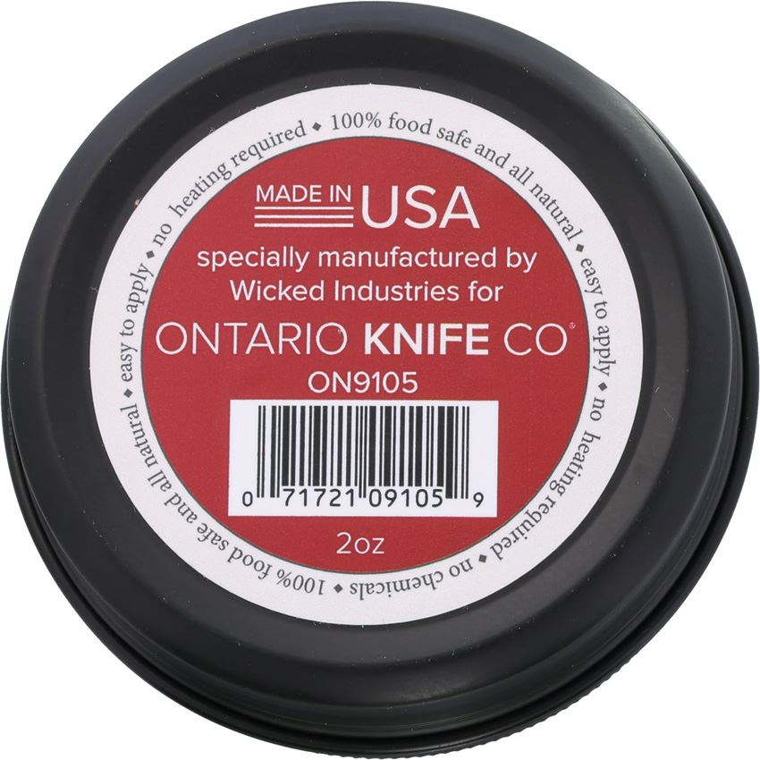 Model/Item/Part Number - ON9105. Ontario OKC Wax 2 oz. 2oz Beeswax based. Food safe, organic, and vegan knife protectant that is perfect for more than just knives. It is great for wood, micarta, plastic, leather, steel, or epoxy based materials. Manufactured by Wicked Industries. Comes in metal tin. Boxed. Made in USA.