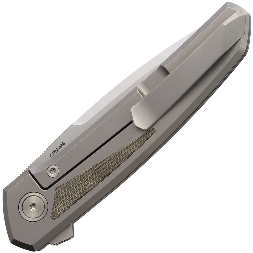 Model/Item/Part Number - PE77. Pena Cobra Framelock Knife Grn/Brn. 4.38" (11.13cm) closed. 3.38" (8.59cm) satin finish flat ground CPM-M4 stainless drop point blade. Gray titanium handle with Green and brown micarta inlay. Pocket clip. Extended tang. Boxed. Made in China.