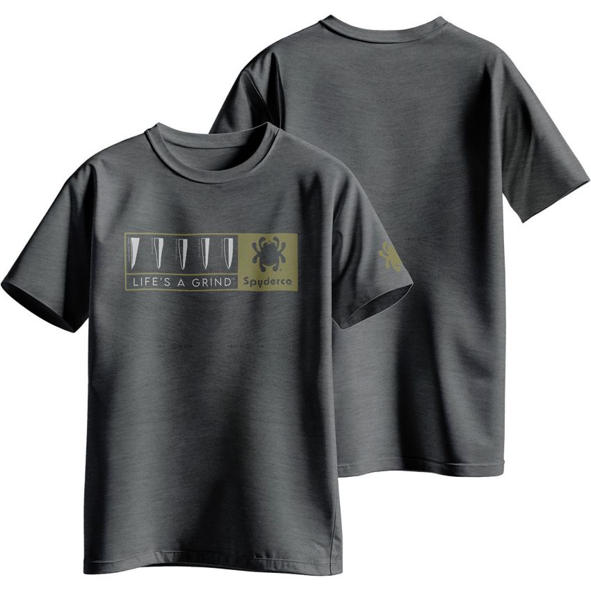 Model/Item/Part Number - SCTS05HGYXL. Spyderco Life's A Grind T-Shirt Gry XL. Features Life s a Grind graphic on the front and a Spyderco bug on the left sleeve. 65% polyester/ 35% cotton construction. Color: Heather gray. Size: X-Large. Bagged. Made in Bangladesh.