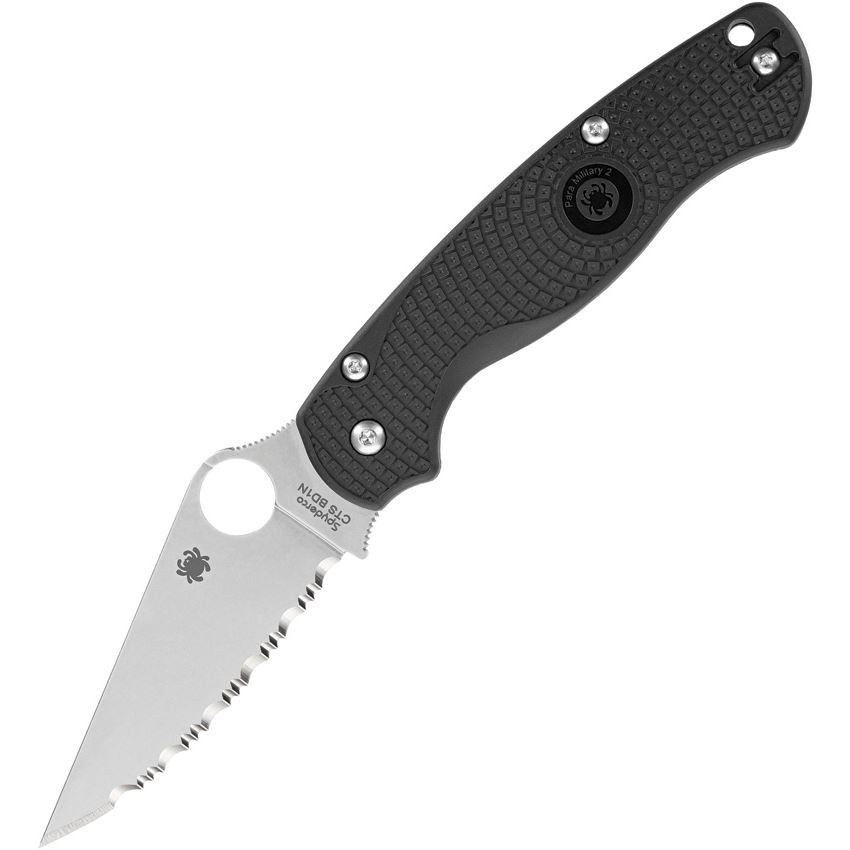 Model/Item/Part Number - SC81SBK2. Spyderco Para Military 2 Compres Lock. 4.88" (12.4cm) closed. 3.5" (8.89cm) satin finish serrated CTS-BD1 stainless blade. Black bi-directional texture FRN handle. Thumb pull. Lanyard hole. Pocket clip. Boxed. Made in USA.