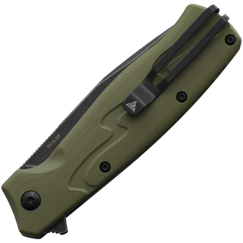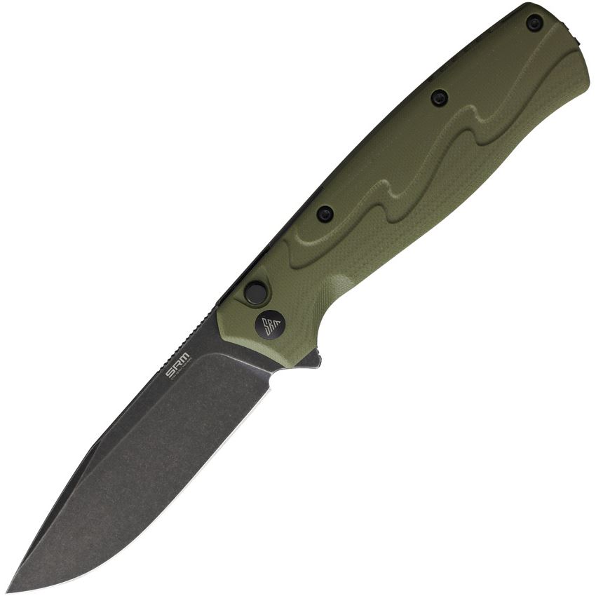 Model/Item/Part Number - SRM221XGP. SRM 221X Button Lock OD. 4.88" (12.4cm) closed. 3.63" (9.22cm) black stonewash finish 14C28N Sandvik stainless bowie blade. OD green sculpted G10 handle. Extended tang. Pocket clip. Boxed. Made in China.
