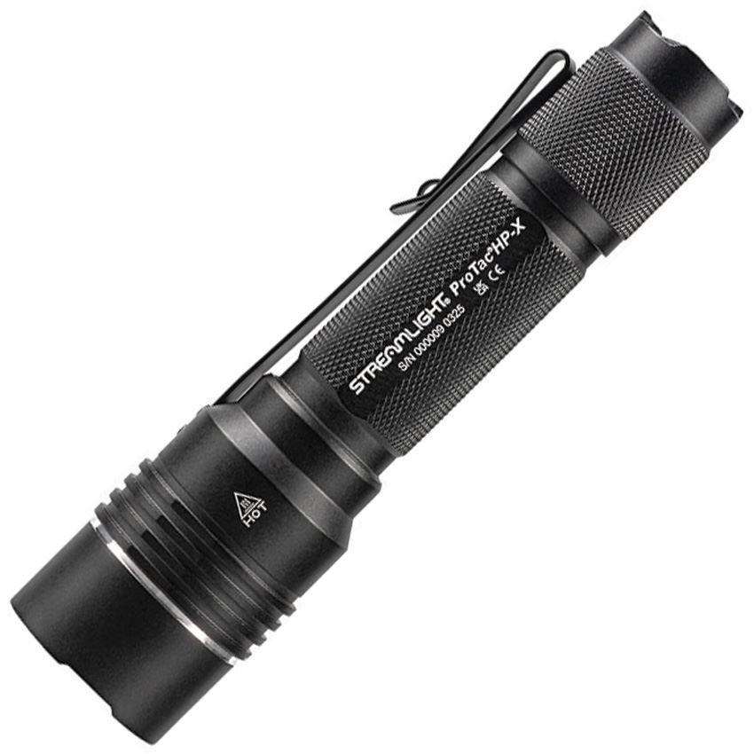 Model/Item/Part Number - STR89021. Streamlight ProTac HP-X Flashlight. 5.5" overall. Water resistant. Impact resistant. Anti-roll design. Clip. Rechargeable. Modes: High (800 lumens, 1.5h runtime); Medium (240 lumens, 4.25h runtime); Low (45 lumens, 24h runtime). 648m beam distance. Uses (1) SL-B26 battery pack (not included). TEN-TAP programmable. Gasket-sealed glass lens., or (2) CR123A batteries (included). Aluminum construction. Color: Black. Boxed with hanging tab. Made in USA.
