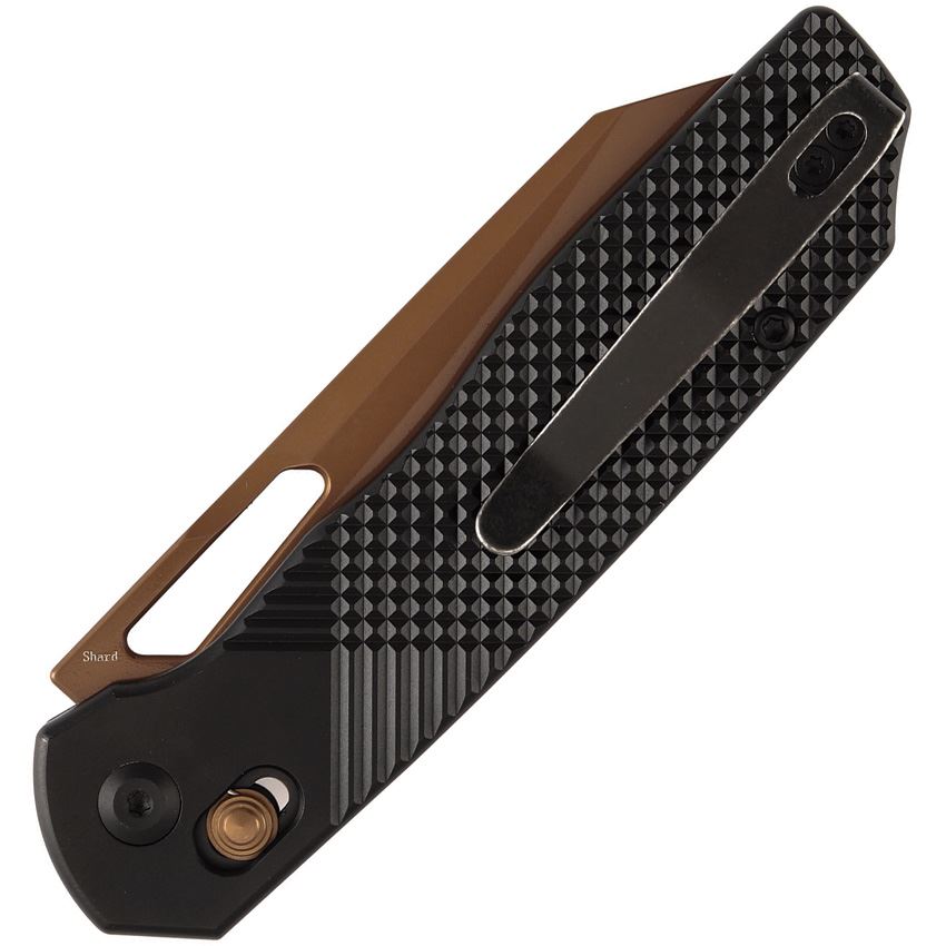 Model/Item/Part Number - T1006V10. Tenable Shard Crossbar Lock Knife Black. 4.5" (11.43cm) closed. 3.5" (8.89cm) 14C28N Sandvik stainless reverse tanto blade. Black aluminum handle. Thumb pull. Pocket clip. Rose gold blade. Diamond texture handle. Boxed. Made in China.