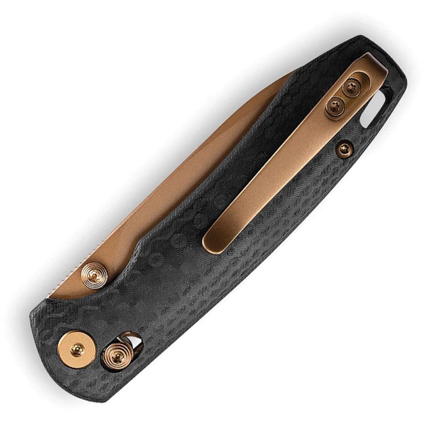 Model/Item/Part Number - TVJM03CG14. Trivisa Dragonfly Crossbar Lock Knife CF. 3.75" (9.53cm) closed. 3" (7.62cm) 14C28N Sandvik stainless drop point blade. Thumb stud. Lanyard hole. Pocket clip. Rose gold finish blade. Carbon fiber G10 handle. Boxed. Made in China.