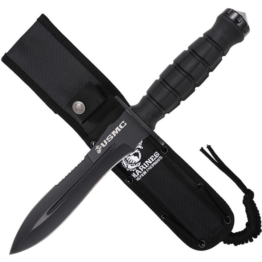 Model/Item/Part Number - USMFIX3002BK. USMC Fixed Blade Knife Black. 11.88" (30.18cm) overall. 6.63" (16.84cm) black coated sawback 3Cr13 stainless blade. Black sculpted FRN handle. Stainless bolster(s). Glass breaker. Black nylon belt sheath. Boxed. Made in China.