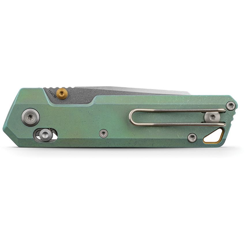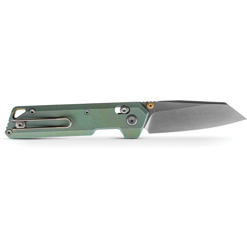 Model/Item/Part Number - VOSA3519. Vosteed Parallel Crossbar Lock Knife Grn. 4.13" (10.49cm) closed. 2.9" (7.37cm) stonewash finish 154CM stainless reverse tanto blade. Green titanium handle. Thumb stud. Lanyard hole. Pocket clip. Black nylon zippered storage case. Boxed. Made in China.