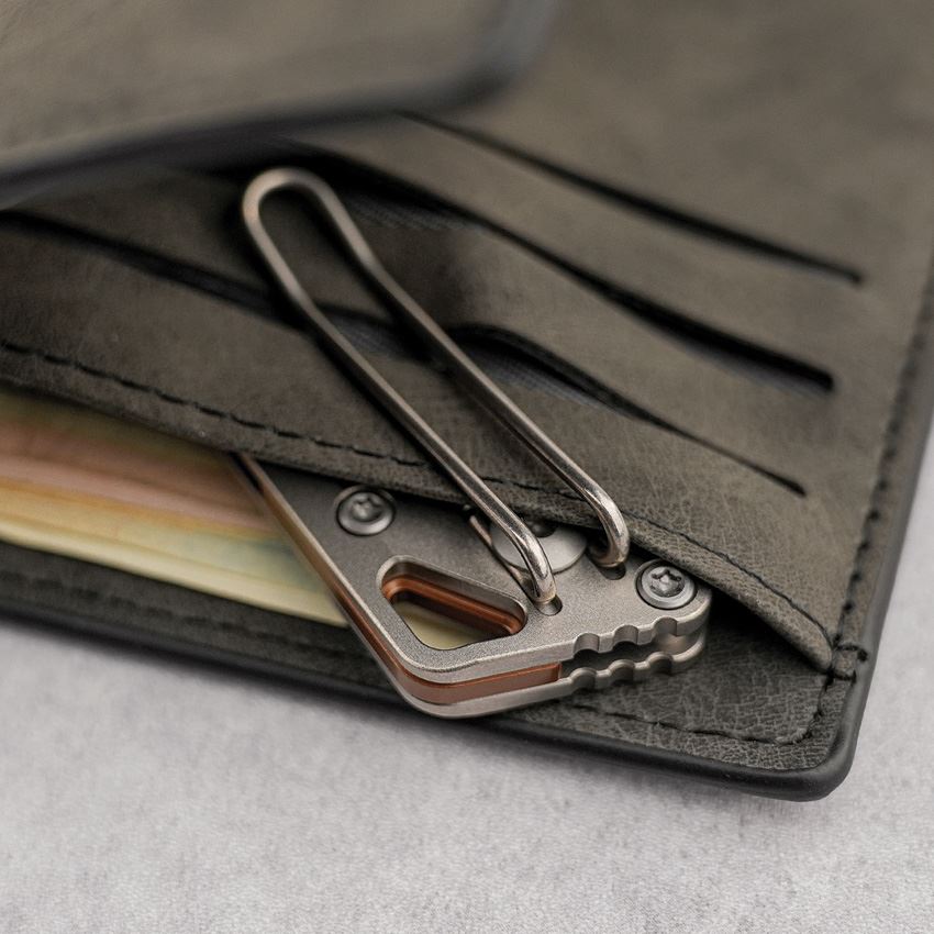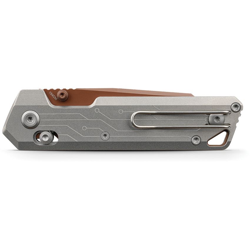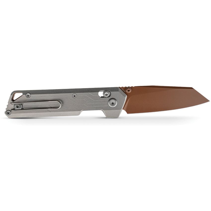 Model/Item/Part Number - VOSA3520. Vosteed Parallel Crossbar Lock Knife Circuit. 4.13" (10.49cm) closed. 2.9" (7.37cm) 154CM stainless reverse tanto blade. Gray titanium handle. Thumb stud. Lanyard hole. Pocket clip. Copper Dune finish blade. Circuit handle artwork. Black nylon zippered storage case. Boxed. Made in China.