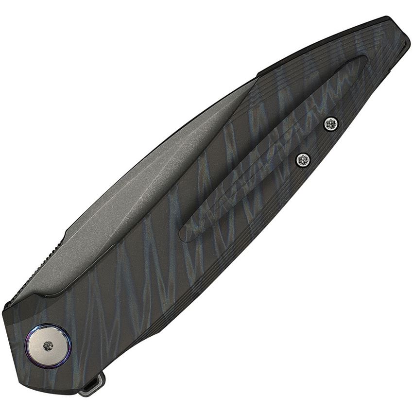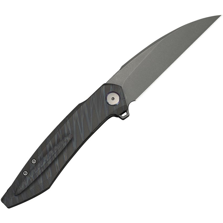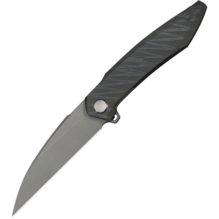 Model/Item/Part Number - WE230713. We Fluxor Nested Linerlock Knife Flm. 5" (12.7cm) closed. 4" (10.16cm) gray stonewash finish Bohler M390 stainless Wharncliffe blade. Tiger striped anodized titanium handle. Extended tang. Pocket clip. Black nylon zippered storage case. Boxed. Made in China.