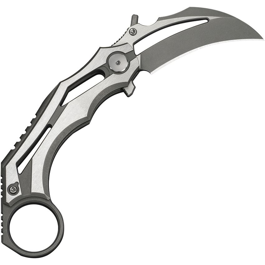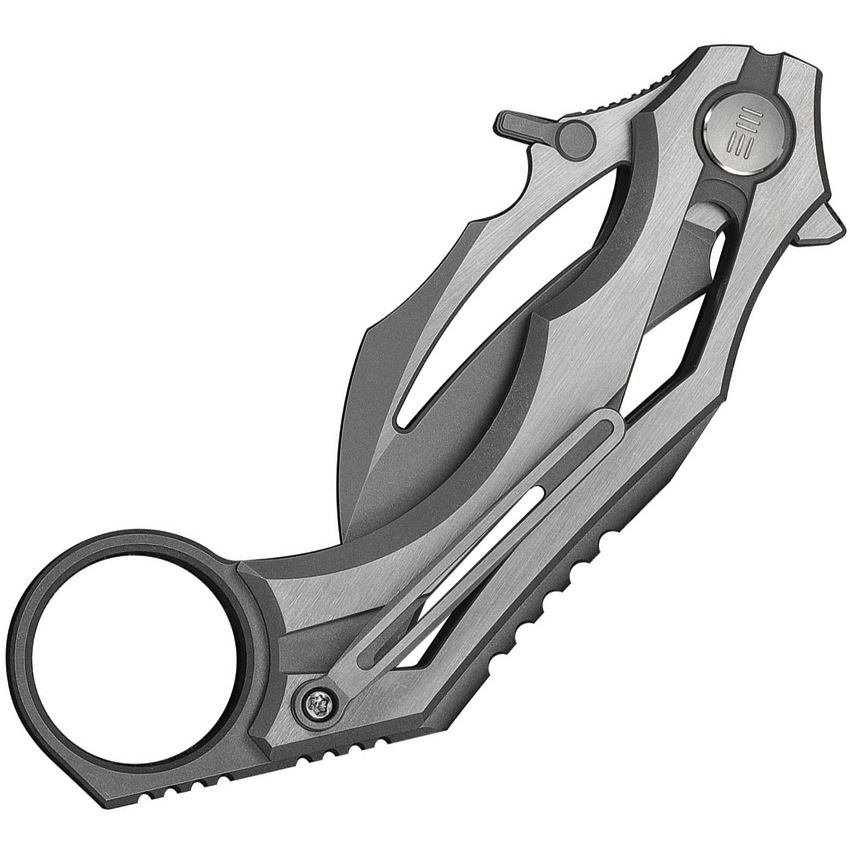Model/Item/Part Number - WE240702. We Cryonix Nested Linerlock Knife Gry. 4.63" (11.76cm) closed. 2" (5.08cm) gray stonewash finish Bohler M390 stainless hawkbill blade. Gray and satin titanium handle. Extended tang. Finger ring. Thumb disk. Pocket clip. Black nylon zippered storage case. Boxed. Made in China.