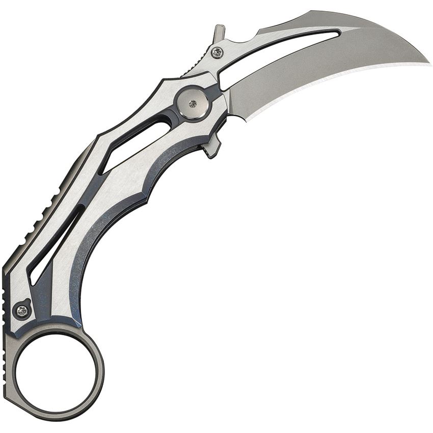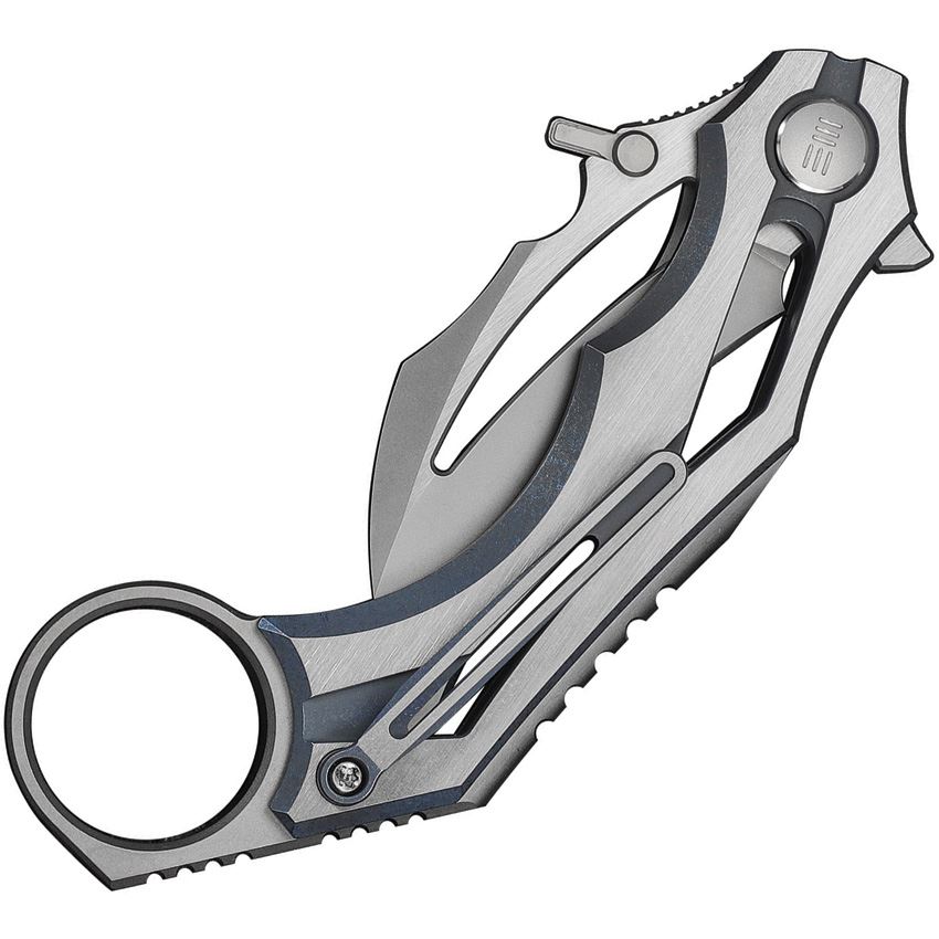 Model/Item/Part Number - WE240704. We Cryonix Nested Linerlock Knife Blu. 4.63" (11.76cm) closed. 2" (5.08cm) stonewash and satin finish Bohler M390 stainless hawkbill blade. Blue and satin finish titanium handle. Extended tang. Finger ring. Thumb disk. Pocket clip. Black nylon zippered storage case. Boxed. Made in China.