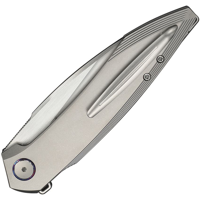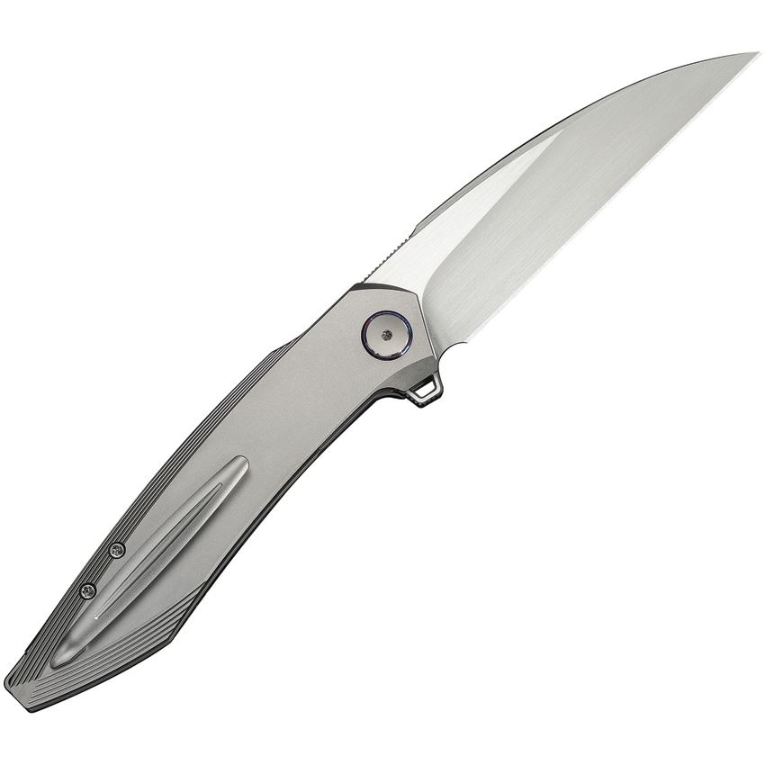 Model/Item/Part Number - WE230712. We Fluxor Nested Linerlock Knife Gry. 5" (12.7cm) closed. 4" (10.16cm) satin finish Bohler M390 stainless Wharncliffe blade. Gray titanium handle. Extended tang. Pocket clip. Black nylon zippered storage case. Boxed. Made in China.