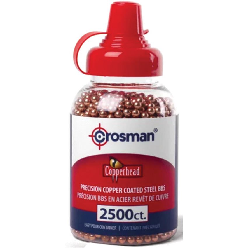 Model/Item/Part Number - CRO0747. Crosman Copperhead BBs 2500 Count. 2500 Count. 4.5mm copper-coated steel BBs. EZ-Pour bottle. Bulk packed. Made in China.