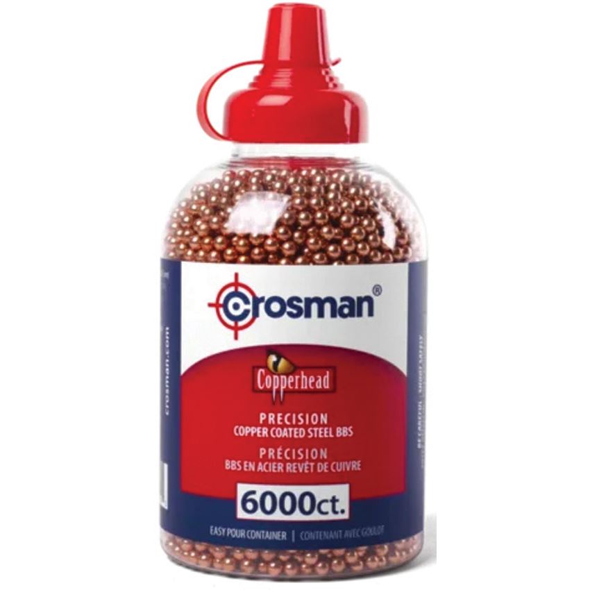 Model/Item/Part Number - CRO0767. Crosman Copperhead BBs 6000 Count. 6000 Count. 4.5mm copper-coated steel BBs. EZ-Pour bottle. Bulk packed. Made in China.