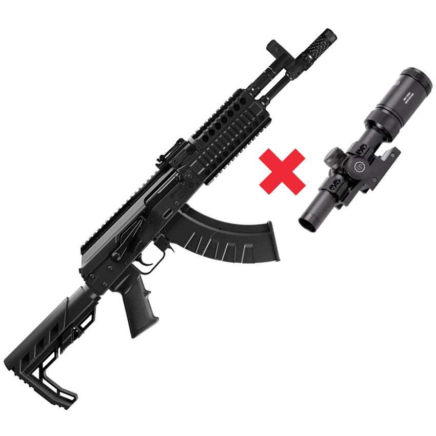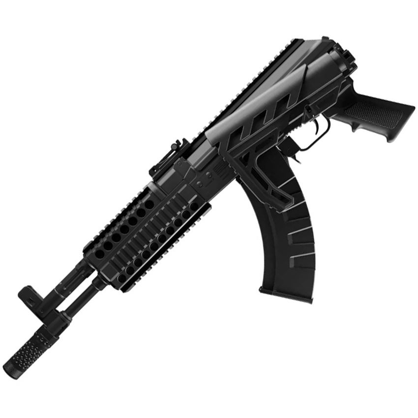 Model/Item/Part Number - CROCAK1. Crosman AK-1 Full-Auto BB Rifle. 34.5" overall. Full/Semi-Auto mechanism. Power Source: 12g CO2 cartridge. Ammunition: Steel BB. 28BB capacity. Smooth bore. Adjustable/removable rear sight. Selector safety. 430 feet per second. Up to 1400 rounds per minute. AK compatible pistol grip. Adjustable and folding 5-position AR compatible stock. Quad rail forearm. Drop-down magazine holds two CO2 cartridges and spring feeds 28 BBs for rapid-fire action. Adjustable butt pad. Picatinny rail. Fixed front sight. Nylon fiber stock. Boxed. Made in China.